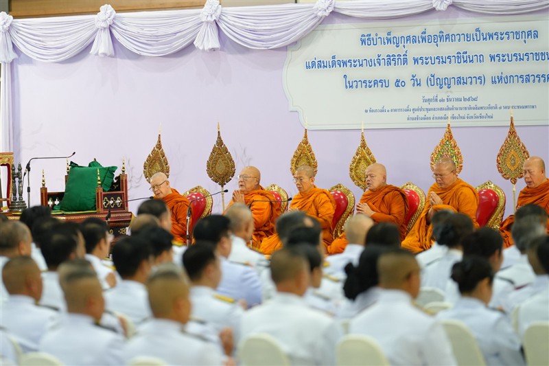 มหาวิทยาลัยแม่โจ้ นำโดย ผู้ช่วยศาสตราจารย์ ว่าที่ ร้อยเอก ดร.จิระชัย ยมเกิด ผู้ช่วยอธิการบดี และคณะผู้บริหารวิทยาลัยบริหารศาสตร์ นำโดย อาจารย์ ดร.พิชญ์ จิตต์ภักดี คณบดีวิทยาลัยบริหารศาสตร์ ได้เข้าร่วมพิธีบำเพ็ญกุศลเพื่ออุทิศถวายเป็นพระราชกุศลแด่สมเด็จพระนางเจ้าสิริกิติ์ พระบรมราชินีนาถ พระบรมราชชนนีพันปีหลวง ในวาระครบ 50 วัน (ปัญญาสมวาร) แห่งการสวรรคต ในวันศุกร์ ที่ 12 ธันวาคม 2568 ณ ห้องรวงผึ้ง 1 อาคารรวงผึ้ง ศูนย์ประชุมและแสดงสินค้านานาชาติเฉลิมพระเกียรติ 7 รอบพระชนมพรรษา ตำบล ช้างเผือก อำเภอเ