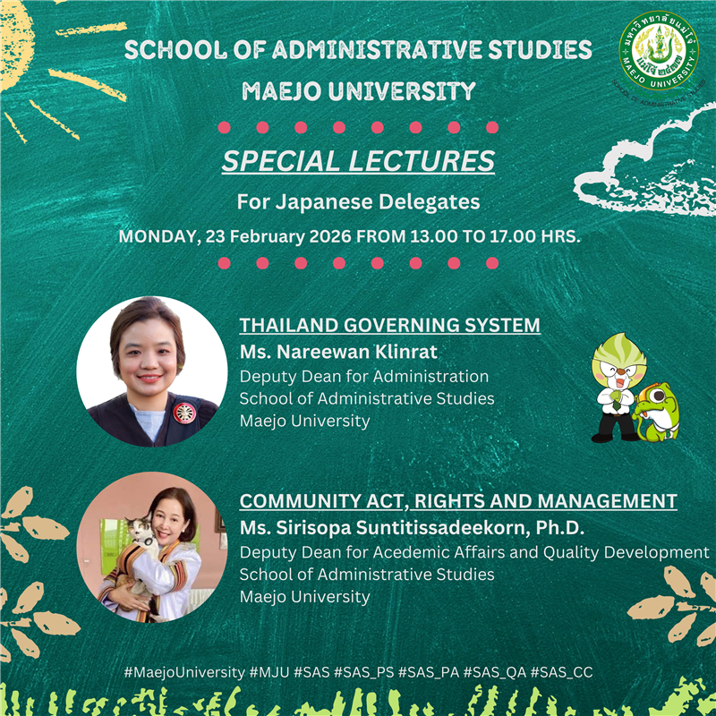 ในโอกาสเข้าเยี่ยมชมและแลกเปลี่ยนทางวิชาการ เพื่อเสริมสร้างความร่วมมือด้านการศึกษา เป็นการต่อยอดความร่วมมือทางวิชาการที่มีมาอย่างต่อเนื่อง ทั้งนี้วิทยาลัยบริหารศาสตร์ได้จัดการบรรยายพิเศษในหัวข้อ “Thailand’s Governing System” ” โดย อาจารย์นารีวรรณ กลิ่นรัตน์ รองคณบดีฝ่ายบริหาร และหัวข้อ “Community Rights and Management” โดย อาจารย์ ดร.ศิริโสภา สันติทฤษฎีกร รองคณบดีฝ่ายวิชาการและพัฒนาคุณภาพ เพื่อเสริมสร้างความเข้าใจเกี่ยวกับระบบการปกครองของประเทศไทย ตลอดจนบทบาทของชุมชนในการบริหารจัดการทรัพยากร เมื่อวันที่ 23 กุมภาพันธ์ 2569 ณ ห้องประชุมราชสีห์ วิทยาลัยบริหารศาสตร์