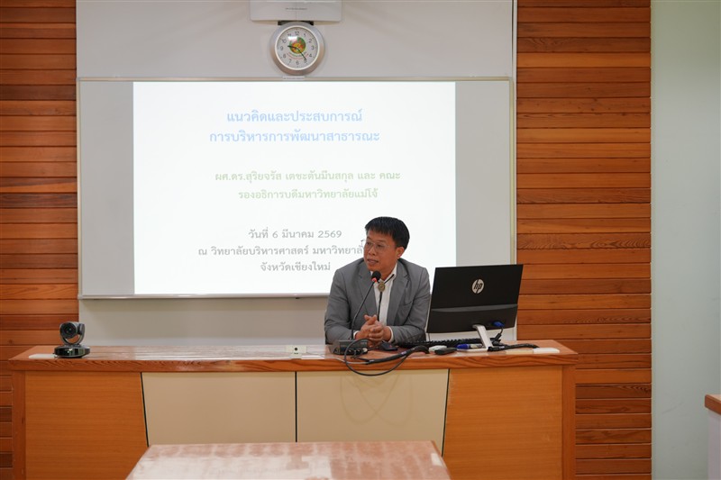 วิทยาลัยบริหารศาสตร์ มหาวิทยาลัยแม่โจ้ นำโดย อาจารย์ ดร.พิชญ์ จิตต์ภักดีคณบดีวิทยาลัยบริหารศาสตร์ ให้การต้อนรับคณะผู้แทนจาก Agroforestry Center Northern ThailandAFC) คณาจารย์และนักศึกษาแลกเปลี่ยนจากประเทศญี่ปุ่น นำโดย Mr. Ikuma Tomita, Director of Agroforestry Center Northern ThailandAssoc. Prof. Dr. Norihito Samata, Musashino University, Tokyo, Japanและนักศึกษาแลกเปลี่ยนจาก Meio University และ Tsukuba University จำนวน 5 คนในโอกาสเข้าเยี่ยมชมและแลกเปลี่ยนทางวิชาการ เพื่อเสริมสร้างความร่วมมือด้านการศึกษา เป็นการต่อยอดความร่วมมือทางวิชาการที่มีมาอย่างต่อเนื่อง ทั้งนี้วิทยาลัยบริหารศาสตร์ได้จัดการบรรยายพิเศษในหัวข้อ “Thailand’s Governing System” ”โดย อาจารย์นารีวรรณ กลิ่นรัตน์ รองคณบดีฝ่ายบริหาร และหัวข้อ “Community Rights and Management”โดย อาจารย์ ดร.ศิริโสภา สันติทฤษฎีกร รองคณบดีฝ่ายวิชาการและพัฒนาคุณภาพ เพื่อเสริมสร้างความเข้าใจเกี่ยวกับระบบการปกครองของประเทศไทย ตลอดจนบทบาทของชุมชนในการบริหารจัดการทรัพยากร เมื่อวันที่ 23 กุมภาพันธ์ 2569 ณ ห้องประชุมราชสีห์ วิทยาลัยบริหารศาสตร์การเยือนครั้งนี้นับเป็นอีกก้าวสำคัญในการขยายเครือข่ายความร่วมมือระหว่างประเทศ และสะท้อนถึงความมุ่งมั่นของวิทยาลัยบริหารศาสตร์ในการส่งเสริมการเรียนรู้ระดับสากลและการแลกเปลี่ยนองค์ความรู้